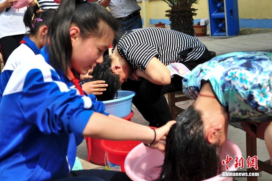 5月8日,小学生给母亲洗头。在母亲节来临之际,济南流海小学的学生给妈妈洗头、剪指甲行孝道,感念母爱。浓浓的亲情与孝道,感动母亲落泪。